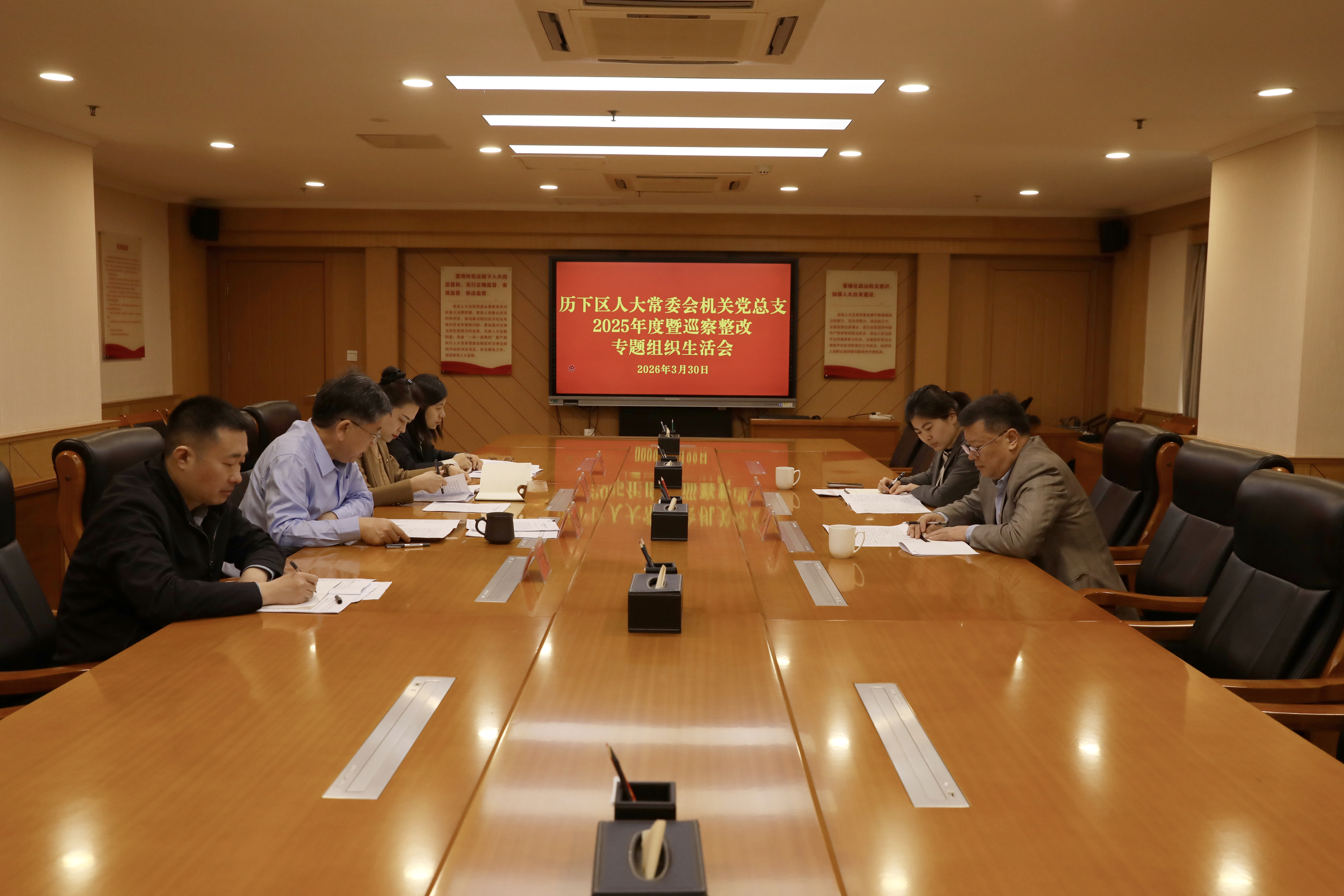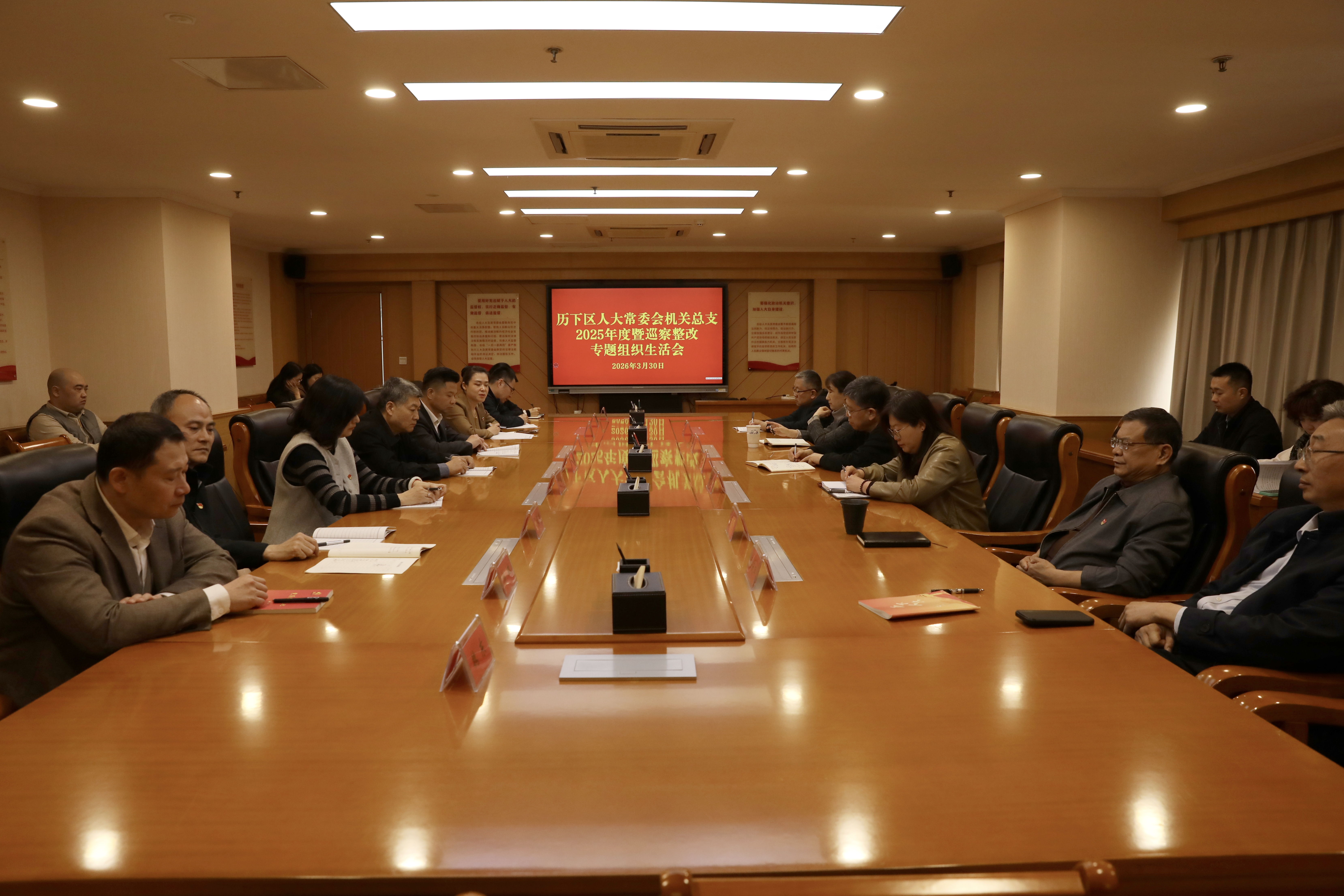3月30日,区人大常委会机关党总支召开2025年度暨巡察整改专题组织生活会。区人大常委会党组副书记、副主任王文利,区人大常委会党组成员、副主任李素婷,机关党总支全体在职党员参加会议,区纪委派驻第一纪检监察组、区委组织部有关领导到会指导。 会议共分四个阶段进行。第一阶段,召开机关党总支委员会会议。区人大常委会党组成员、办公室主任,机关党总支书记谢万清主持会议并代表机关党总支作检视剖析,随后带头作个人对照检查,党总支委员逐一发言,严肃认真开展批评与自我批评。大家敞开心扉、坦诚相见,问题找得准、批评意见诚恳,达到了预期目的。谢万清在总结时对整改工作提出明确要求,要强化理论武装,坚持不懈以习近平新时代中国特色社会主义思想凝心铸魂;要压实主体责任,以“咬定青山不放松”的精神持续推进整改工作,扎实做好巡察“后半篇文章”;要严格监督管理,驰而不息纠治“四风”,加强机关干部作风建设;要坚持廉洁自律,严格遵守中央八项规定及其实施细则精神,自觉接受各方面监督。 第二阶段,召开机关支部委员会会议,参照党总支委员会会议程序进行。支部委员依次作检视剖析,深入开展批评与自我批评,进一步查摆问题、明确整改方向。第三阶段,以党小组为单位召开组织生活会。机关处级干部带头剖析检视,党员逐一进行对照检查,相互开展批评和自我批评,取得了相互教育、相互警醒的良好效果。第四阶段,召开党员大会。机关支部书记主持会议,通报支部委员会召开情况,并组织开展了党员民主评议工作。 本次专题组织生活会准备充分、程序规范,与会同志紧扣主题、深入查摆,自我批评不遮不掩,相互批评坦诚相见,整改措施务实具体,达到了统一思想、增进团结、改进工作的目的。